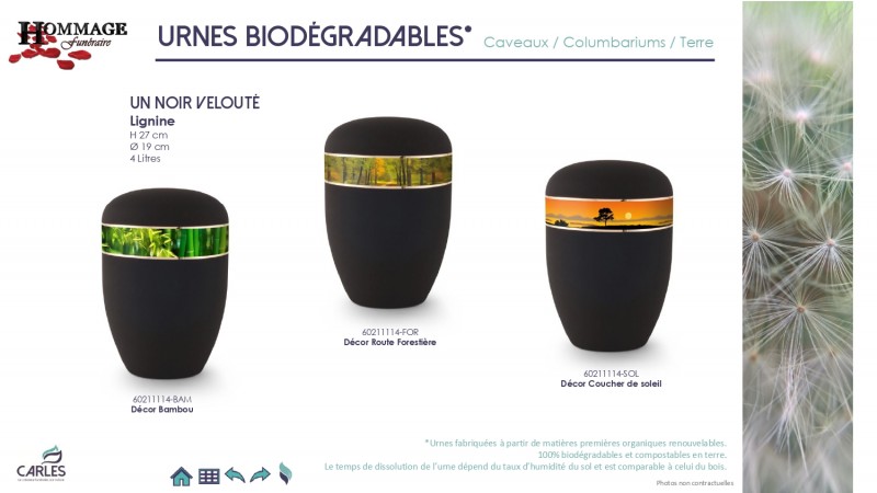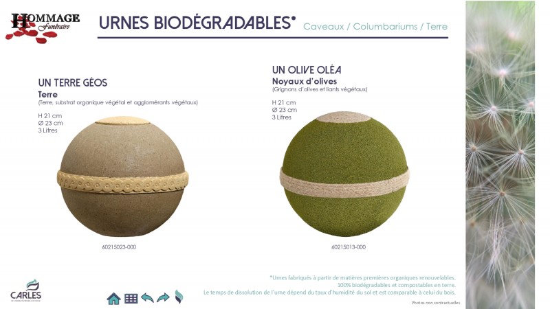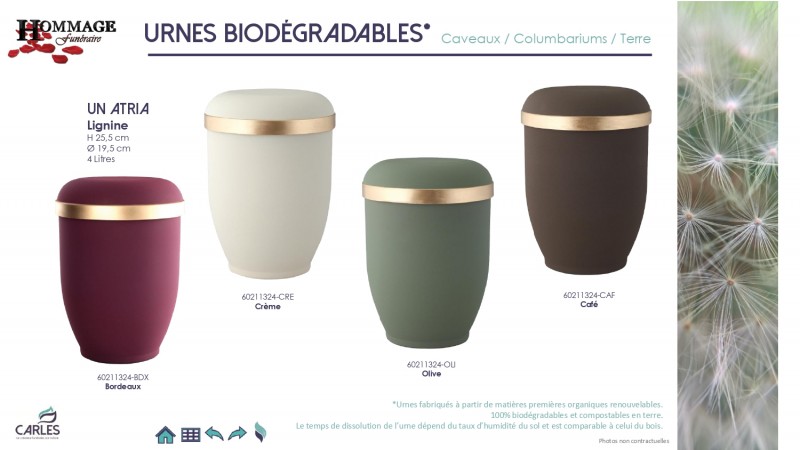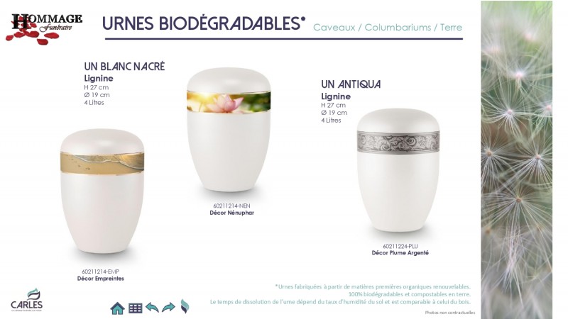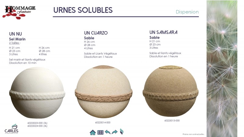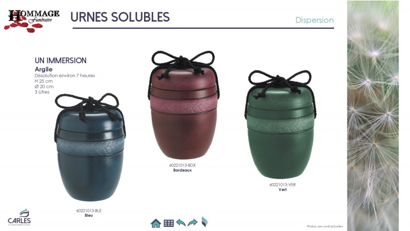 Les urnes solubles HOMMAGE Funéraire sont quant à elles idéales pour les personnes ayant émis le souhait de voir leurs cendres rejoindre la mer. En effet, pour éviter les désagréments éventuels liés à l'ouverture de l'urne lors de la dispersion, ces urnes solubles sont prévues pour être déposées sur l'eau ; celle-ci va s'immerger tout en douceur, pour se désintégrer naturellement, et laisser ainsi les cendres se disperser au fil de l'eau..